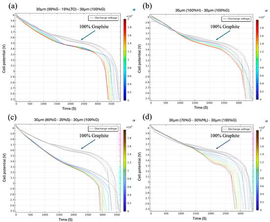 Cell potential evolution during discharge for (a) 30 µm (90%G–10%LTO) − 30 µm (100%G), (b) 30 µm (100% H) + 30 µm (100% G), (c) 30 µm (80%G–20%S) − 30 µm (100%G), and (d) 30 µm (70%G–30%ML) − 30 µm (100%G).