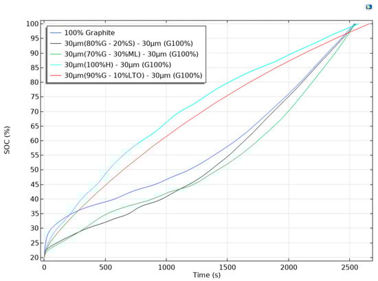 Figure 6 compares the state of charge (SOC) evolution during the 2000th charge of five pouch cells that shared an identical cathode/electrolyte setup but differed in the architecture of a 60 µm anode. The blue trace represents the reference electrode, a monolithic 60 µm layer of graphite. Its curve showed the familiar profile of graphite with a rapid rise during the initial stage’s transitions, followed by a pronounced inflection after ≈500 s as the material approached full lithiation.