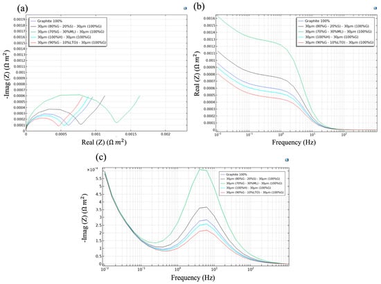 Figure 7a presents the Nyquist response of the five simulated pouch-cells and shows how the inner layer governs the overall electrochemical footprint once the outer 30 µm graphite buffer is fixed. The diameter of each semicircle diverges in proportion to the transport penalties introduced by the second layer.
