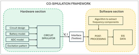 In this paper, an integrated co-simulation framework is proposed, which simulates the EIS system as a whole. It is made of a CAD circuit simulator directly linked to a numerical environment executing the impedance estimation algorithms. In this way, the effect of the non-idealities of the hardware design on the final impedance estimate can be identified. A model of the battery pack/module/cell can be included as well, to allow for a complete simulation. The purpose of such a simulation framework is to design both HW and SW according to an integrated approach, analyze the performance of an existing EIS-based prototype, or investigate sources of uncertainty (and correctly locate them within either the HW architecture or the SW algorithms) that otherwise are difficult, or even impossible, to be separately characterized when only experimental tests on the prototype are carried out. Given the completeness of the co-simulation framework and its capability to emulate HW–SW interrelations, it can also be used as the main simulator within a digital twin of the sensorized battery. Therefore, the final goal of the co-simulation framework is to emulate as accurately as possible the real implementation of the EIS system when connected and operating on the DUT, whatever the battery under test. In the literature, to the best of the authors’ knowledge, there are no similar simulation frameworks that provide a complete overview of the entire EIS-based system with insights into HW–SW interactions.