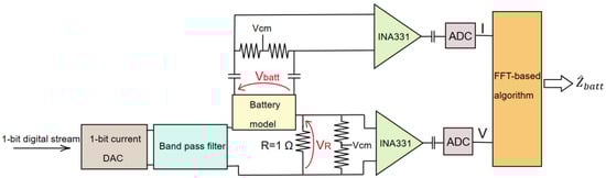 The circuit presented in [25] and reported in Figure 2 consists of the 1-bit delta-sigma digital-to-analog converter (DAC) combined with a voltage-to-current converter and a bandpass filter [18] for the generation of the current test signals, and two identical channels of measurement: one used to sense the voltage drop across the battery cell and the other used to sense the voltage across a 1- reference resistance. The EIS system exploits multisine excitation to reduce the measurement time. This multisine signal is synthesized in Matlab and modulated following a delta-sigma approach to create a 1-bit digital stream used as input (excitation pattern in Figure 1) to the DAC. The DAC output is then converted to a binary current signal (+Iref and −Iref) corresponding to bits 1 and 0. The exact value of Iref can be set by the final user; however, a fixed nominal current of 1 mA is considered in this work. Then, the bandpass filter (BPF) removes the high-frequency noise typical of sigma-delta-modulated signals. This approach allows for the generation of a current excitation signal with a good signal-to-noise ratio (SNR). After the filter, the measurement architecture consists of two acquisition channels acquiring the voltage drop across the battery cell and a reference resistor, respectively. The two voltages are then amplified by a factor of 900 using the Texas Instruments INA331 instrumentation amplifier (INA), whose SPICE model is provided by the manufacturer and used as input to the framework. One channel is AC connected to the terminals of the battery cell via high-value capacitors to filter out the inherent DC voltage component of the battery, even though the DC voltage of the battery is not modeled in the following tests. Polarization of the instrumentation amplifier is then assured by a resistive network made of high-value resistors. The other channel is DC connected to the reference resistor; however, the resistive polarization circuit is still present to force the instrumentation amplifier to work on the same biasing region, improving the symmetry of the system. In both cases, the input impedance of the acquisition channel is very high, making the burden current negligible. From these two direct measurements, it is possible to estimate the battery impedance following the two-voltage measurement approach [38]. At the end of each estimation channel, an ideal ADC models the acquisition channel of the high-resolution digitizer used in the prototype. The input capacitor of the ADC represents the AC coupling of the digitizer.