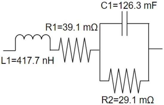 Simplified equivalent circuit model of the fully charged battery cell Samsung ICR18650-26J used in the simulation framework for the preliminary analysis. Values of the parameters were experimentally extracted using the benchtop Hioki IM3590 Chemical Impedance Analyzer.
