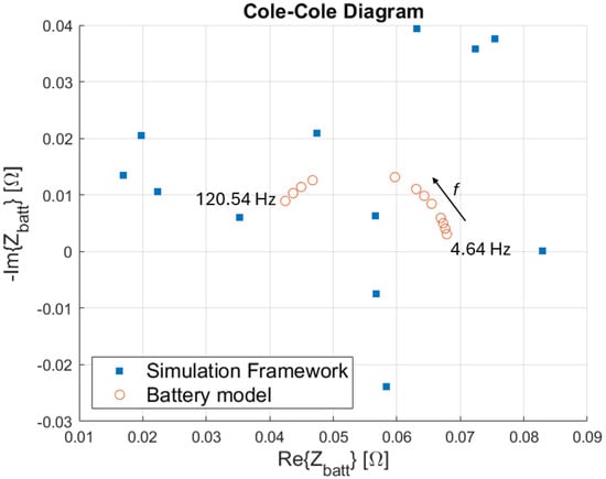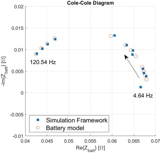 Fractional-order circuits have found widespread use in different applications, such as biochemistry and medicine, to model diffusive phenomena like the double-layer effect at solid–liquid interfaces [45,46,47]. Detailed studies about the relationship between the EIS response and the physical phenomena occurring in the battery cell can be found in [48,49,50]. For the test reported in the following, the values of the two resistors and the parameters characterizing the CPE were experimentally extracted by means of measurements carried out with the Hioki Chemical Impedance Analyzer connected to a fully charged lithium-ion battery cell.