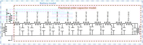 Fractional-order ECM of a battery cell, including a CPE (highlighted in red) approximated by a ladder of purely passive elements in the frequency range [4 Hz–120 Hz].