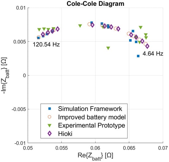 After the implementation of an improved battery cell ECM, it was possible to compare the predictions provided by the co-simulation framework with the experimental results obtained by the prototype of the EIS-based monitoring system applied to a real fully charged lithium-ion battery, as shown in Figure 13. Even in this case, the agreement between the co-simulation framework predictions and the ECM analytical values is high, with minimal discrepancies at the very low frequencies, which can be related to inaccuracies of the HW/SW design architecture and point out possible improvement directions. The simulation results are in good agreement also with the experimental prototype. The differences between the results of the simulation and the experimental prototype can be ascribed to non-idealities and parasitic effects not yet modeled in the co-simulation framework, as discussed in Section 3. For instance, connection impedances are not modeled in the simulation, while it is known that their effect is not negligible when monitoring devices with very low-value impedances, like the battery cells. Moreover, there is an inherent technological dispersion of the parameters of the EIS system with respect to those used in the models for the components employed in the CAD. To exploit the simulation framework within a digital twin, those dispersive effects should be experimentally evaluated, and their estimate should be added to the system model.