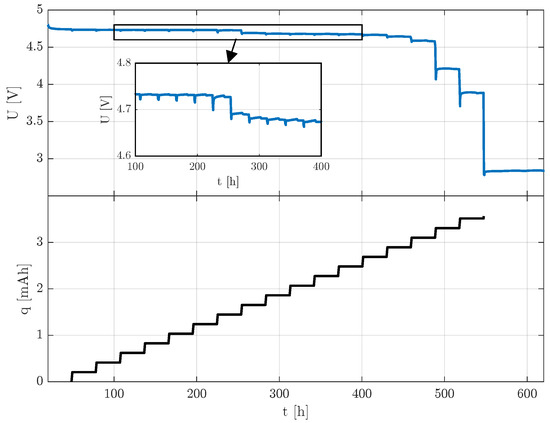 To determine the entropy coefficient of the LNMO cathodes, the potentiometric method was chosen. This method has already been demonstrated in various studies on cathode materials such as LFP [50], lithium–manganese–iron–phosphate (LMFP) [51], lithium–manganese–oxide (LMO) [52], lithium- and manganese-rich layered composite cathodes (LMR) [46], lithium–nickel–cobalt–aluminum–oxide (NCA) [46], and NCM [46,53], as well as on anode materials, such as graphite [44,53], lithium–titanate–oxide (LTO) [51], and silicon [54]. The measurement was subdivided into several discharging and charging steps, leading to stepwise lithiation or delithiation of the electrode. Figure 1 demonstrates the resulting voltage signal of cell 1 due to the stepwise discharge.