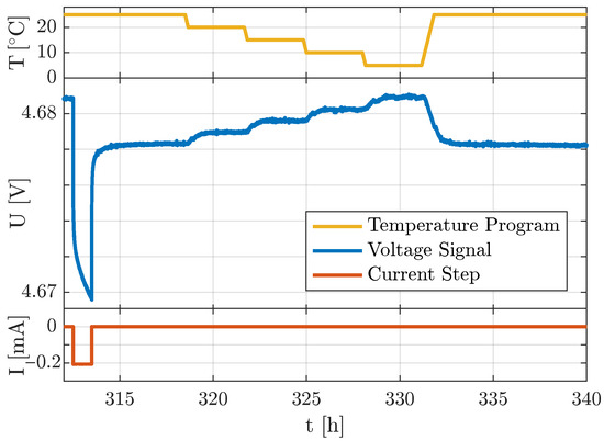 In the second segment, the cell voltage relaxes. An open-circuit voltage (OCV) phase is applied for approximately 6 h during discharge and 8 h during charge. The variation in relaxation time results from a desynchronization between the temperature chamber and the potentiostat. The third segment involves temperature variation. During this segment, the temperature chamber cools down in 5 °C steps. Each cooldown is performed at a rate of −0.5 K/min and takes 10 min. Each temperature is maintained for 3 h. The set temperatures are 25 °C, 20 °C, 15 °C, 10 °C, and 5 °C. Finally, the temperature chamber is heated back to 25 °C at a rate of 0.5 K/min. During this segment, the potentiostat remains in the OCV phase. Finally, the fourth segment consists of an OCV phase until the next SoC step is initiated.