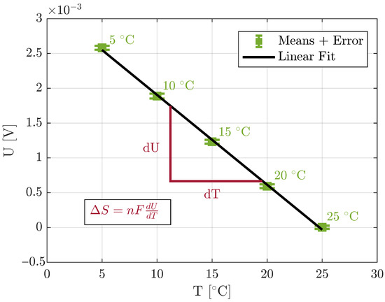 For each temperature step, the resulting voltage value was obtained by calculating the mean of the voltage values in the 10 min before the next temperature change. Subsequently, the voltage values for each temperature were plotted, as shown in Figure 3. The resulting slope of the linear voltage data fit was then used to calculate the entropy coefficient according to Equation (6), with .