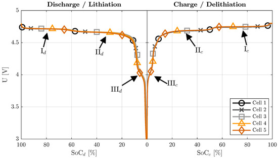 To identify the SoC positions of the reaction steps during discharge and charge, the voltage curves of all five cells are shown in Figure 4. In agreement with the literature [55], three distinct voltage segments can be observed for disordered LNMO: one at approximately 4.7 V, a second at 4.65 V, and a third at 4.0 V. Table 3 links these reaction steps to the corresponding reduction and oxidation reactions.