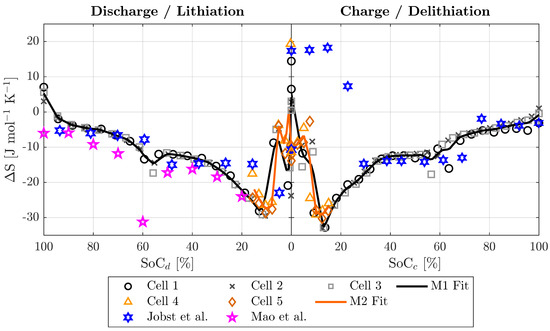 The reversible heat flux is generated by entropy changes in the electrodes, which occur due to the lithiation and delithiation of the electrode material [29]. As different phase transitions and lithiation mechanisms take place, the entropy change strongly depends on the electrode materials used and the SoC of the cells [44,45,46]. To calculate this, it is essential to determine the entropy coefficient, , which describes the variation in as a function of temperature T. The reversible heat flux is then given by