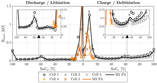 However, at the SoC extremes and at the transition between reaction steps, the literature data show that increases, whereas in our measurements, the resistance also increases. This behavior cannot be explained by concentration resistance, since an increase in would typically result in a decrease in resistance.