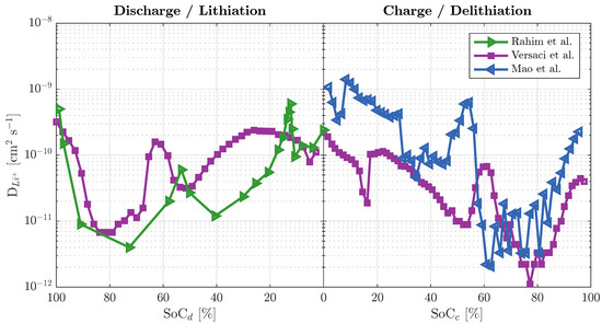 First, concentration resistance results from low lithium diffusion, whose main parameter is the diffusion coefficient . Reported values for range from to [39,40,41,42]. Figure 7 summarizes the SoC-dependent diffusion coefficients for charge and discharge as reported in various literature sources. According to these studies, exhibits three minima during both discharge and charge. The minimum below 20% is attributed to Mn reaction step III. This minimum appears as a sharp peak, which would coincide with reported resistance observations and explains the difficulty in capturing a measurement point at this peak using the potentiometric method.