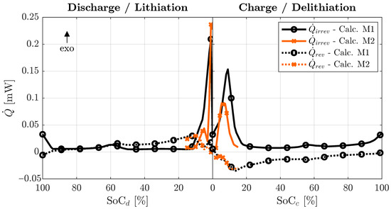 During charge, an initial irreversible heat flux peak is observed in both calculations, followed by a relatively constant low exothermal irreversible heat flux. In both cases, the reversible heat flux decreases until it reaches an of approximately 10%. A negative value corresponds to an endothermal heat flux, indicating that, at around 10% , the highest amount of heat is absorbed. Afterward, the heat flux declines until it is close to 0 mW when fully charged. Throughout the entire charging process, the reversible heat flux remains endothermal.