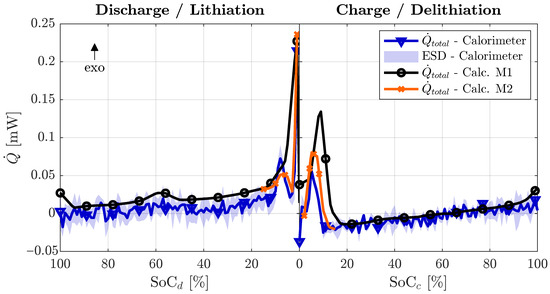 Comparison of the total heat flux of disordered cathodes during discharge and charge between the calculations (M1—black; M2—orange) and a calorimetric measurement. For both the calculations and the measurement, a C-rate of 1/ and an isothermal temperature of 25 °C were applied. The calorimetric measurement represents the mean of three smoothed coin cell measurements. The estimated standard deviation (ESD) is calculated from the standard deviation of these three measurements.