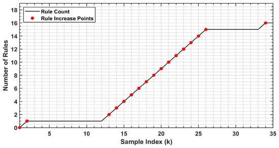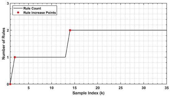 The potential function is designed to quantify statistical deviation, which increases when the current data vector differs from previously observed samples. While this potential function facilitates the detection of new patterns, it can also be triggered in regions already covered by existing fuzzy rules, particularly in the presence of noise. This is because the potential score is derived mainly from data characteristics without considering the current rule base. As a result, new rules may be created unnecessarily, leading to model overgrowth, increased inference complexity, and reduced model generalization. Figure 1 illustrates this issue using a simulation of a 4-steps-ahead prediction task on the Mackey-Glass benchmark dataset [48]. The system expands from a single initial rule to 16 rules within just the first 35 data samples, which demonstrates that the model interprets minor input variations as new, triggering excessive rule creation even in regions already well represented. In real-world applications, such behavior can lead to overfitting, increased computational cost, and degraded performance, especially under noisy conditions.