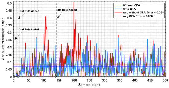 The CFA optimization process runs for a limited number of iterations (e.g., t = 10), during which each firefly candidate updates its rule center and width based on the guided movement strategy. After completing the iterations, the candidate with the lowest prediction error is selected to define the new rule, which is then integrated effectively into the existing model structure. Figure 3 presents a comparison of the absolute prediction error over 500 data samples for both CFA-optimized and non-optimized scenarios, using a 4-steps-ahead prediction task using the Mackey-Glass benchmark under a high level of additive Gaussian noise (standard deviation = 0.12). The results illustrate the importance of optimizing the initial parameters of newly generated rules to ensure they are well-aligned with the current input space, which is important particularly in noisy environments.
