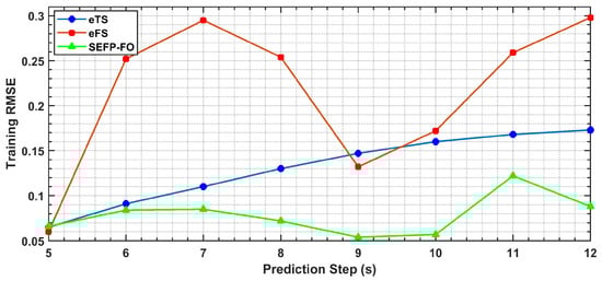 Comparison of training RMSE across prediction steps (s = 5 to 12) using the eTS, eFS, and SEFP-FO techniques.