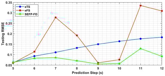 Comparison of testing RMSE across prediction steps (s = 5 to 12) using the eTS, eFS, and SEFP-FO techniques.