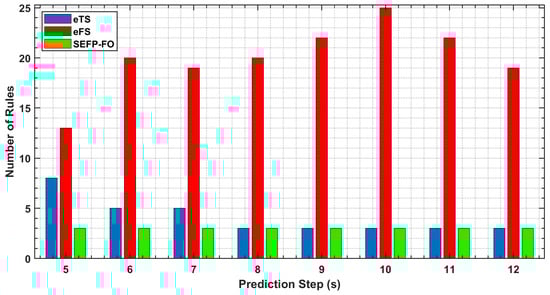 This test is performed to evaluate the long-term prediction accuracy and structural efficiency of the proposed SEFP-FO technique under strong nonlinearity conditions. To fairly assess each technique’s ability to learn and generalize complex nonlinear dynamics, this test uses a noise-free Mackey-Glass dataset with a longer time delay of , to make the time series more chaotic and challenging than the commonly used setting (e.g., ). This condition is intentionally chosen to examine the models capability to handle highly nonlinear patterns without the influence of external noise. In this test, prediction accuracy is measured using the root-mean-square error (RMSE), where lower RMSE values indicate better performance. Also, model compactness is evaluated based on the number of fuzzy rules created during training. Because evolving fuzzy systems are updated online, a smaller rule base usually requires less computation per update. Table 2 summarizes the performance of the three techniques (i.e., eTS, eFS, and the proposed SEFP-FO) across multi-step prediction from s = 5 to 12, presenting both training and testing RMSE, as well as the number of rules. Training RMSE is also included to measure overfitting or underfitting when relevant. For instance, comparing training and testing RMSE values can indicate whether a model achieves generalization (close agreement), or suffers from underfitting (consistently high values) or overfitting (large gaps between training and testing errors). Figure 4 presents the training RMSE across prediction steps (s = 5 to 12) using the related techniques. Figure 5 shows the corresponding testing RMSE trends using the three techniques. Figure 6 provides a bar chart comparing the number of fuzzy rules (i.e., model complexity) at each prediction step.