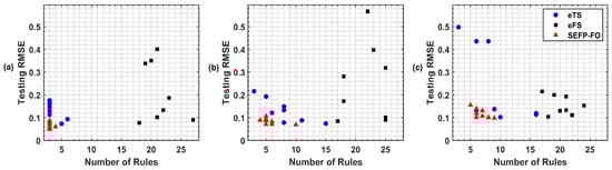 This trend continues at s = 8, where SEFP-FO outperforms both techniques with a testing RMSE of 0.071, which is around 45% lower than that of eTS and 60% lower than that of eFS. At s = 10, it achieves a testing RMSE of 0.057, outperforming eTS by 65% and eFS by 25%, again with a much simpler structure. Even at longer prediction horizons such as s = 12, SEFP-FO performs the best, reaching a testing RMSE of 0.092, which is nearly 50% lower than that of eTS and over 70% lower than that of eFS. Although the eFS technique slightly outperforms SEFP-FO at s = 5, with a testing RMSE of 0.060 versus 0.063, this minor gain in accuracy comes at the cost of significantly higher model complexity, with 13 vs. 3 rules. This indicates that eFS may have achieved this lower error at this step by overfitting through excessive rule growth, rather than by learning a simpler generalizable structure. The proposed SEFP-FO generates lower errors and fewer rules and results in higher computation efficiency, which benefits real-world applications.