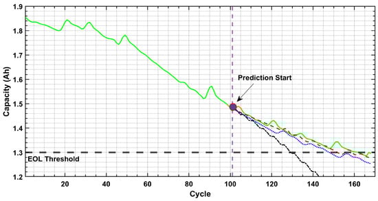 In this context, accurate and timely prediction of a battery’s remaining useful life (RUL) has become a key pillar of modern battery management systems. Effective RUL estimation can enable proactive maintenance, enhance system reliability, and support informed planning and health management [7,8]. The practical importance of accurate RUL prediction has been highlighted across multiple domains. In electric vehicles, for example, studies such as [9] show that RUL-aware prediction strategies are essential for safe operation and energy efficiency. Beyond electric vehicles, recent reviews emphasize that RUL prediction is equally critical in other fields, such as grid-scale storage, where unexpected failures can disrupt power supply, and medical devices, where battery reliability is directly linked to patient safety [1,2,3,7,10]. Together, these examples make it clear that RUL prediction is not only a technical challenge but also a practical necessity for ensuring safety, sustainability, and cost-effectiveness in real applications. On the other hand, RUL prediction remains a highly challenging task, as battery degradation is influenced by a complex interplay of nonlinear and nonstationary processes that evolve under different operating conditions and usage patterns [11,12,13]. Factors such as temperature, load profiles, charge–discharge strategies, and intrinsic electrochemical characteristics make the underlying degradation behavior difficult to model accurately [5,10,14]. Furthermore, the presence of measurement noise and system-level uncertainties limits the effectiveness of traditional model-based and static data-driven methods [6,11].