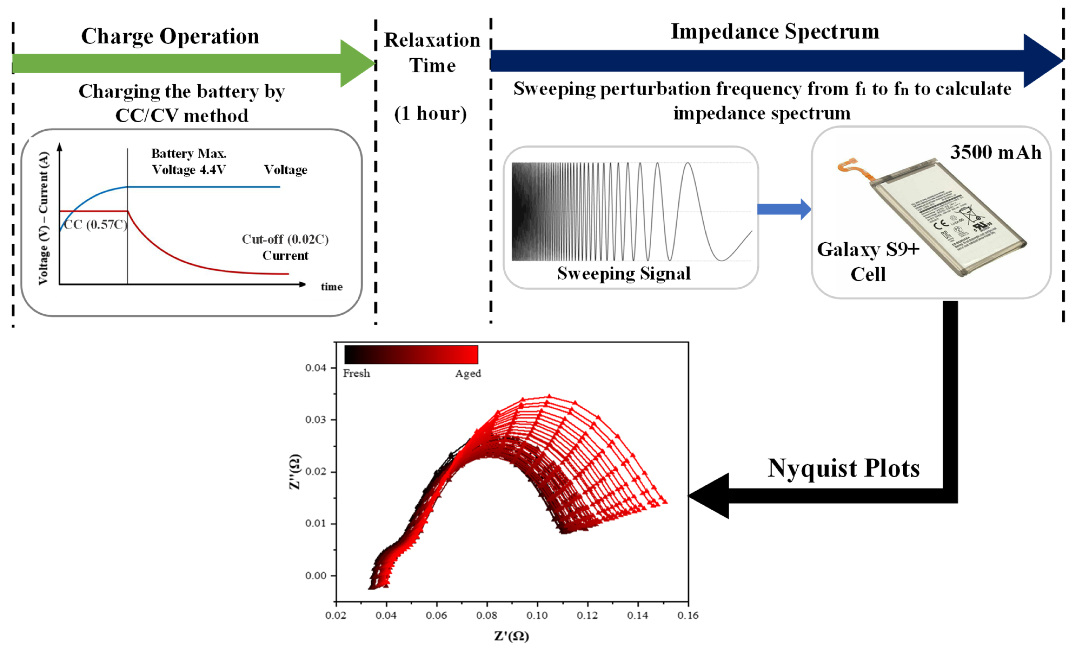 The aging test included LIBs sourced from the Samsung Galaxy S9+ smartphone and subjected to 1000 charge–discharge cycles at 25 °C. Capacity and impedance spectra were recorded every 20 cycles using HYSCLAB environmental chambers (HYSC Co., Ltd., Seoul, Republic of Korea) and WonATech WBCS3000 M2 (WonATech Co., Ltd., Seoul, Republic of Korea) and ZIVE MP2A equipment (WonATech Co., Ltd., Seoul, Republic of Korea). The EIS measurements for the Galaxy S9+ batteries were performed using a 100 mV perturbation in the frequency range of 0.1–4 kHz. The battery specifications are detailed in