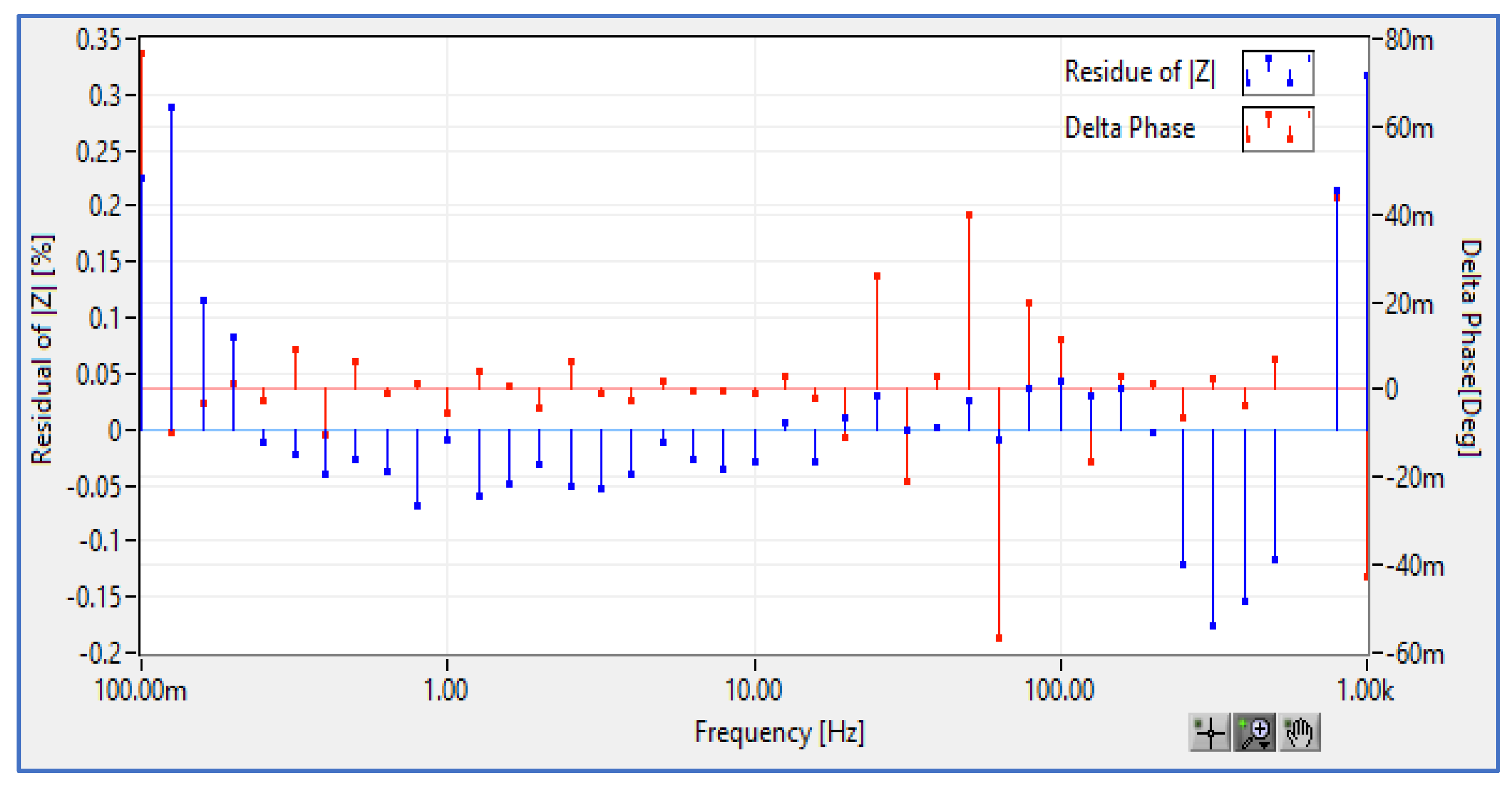 the model impedance. The Kramers–Kronig (K–K) relations were applied to examining the real and imaginary components of impedance, specifically for the 18650 Li-ion battery (LiB). To ensure the accuracy of the experimental data, it was crucial that the relative residual difference between the measured values and the impedance spectrum reconstructed using K–K relations stayed within 1% across the entire frequency range. The analysis, as shown in