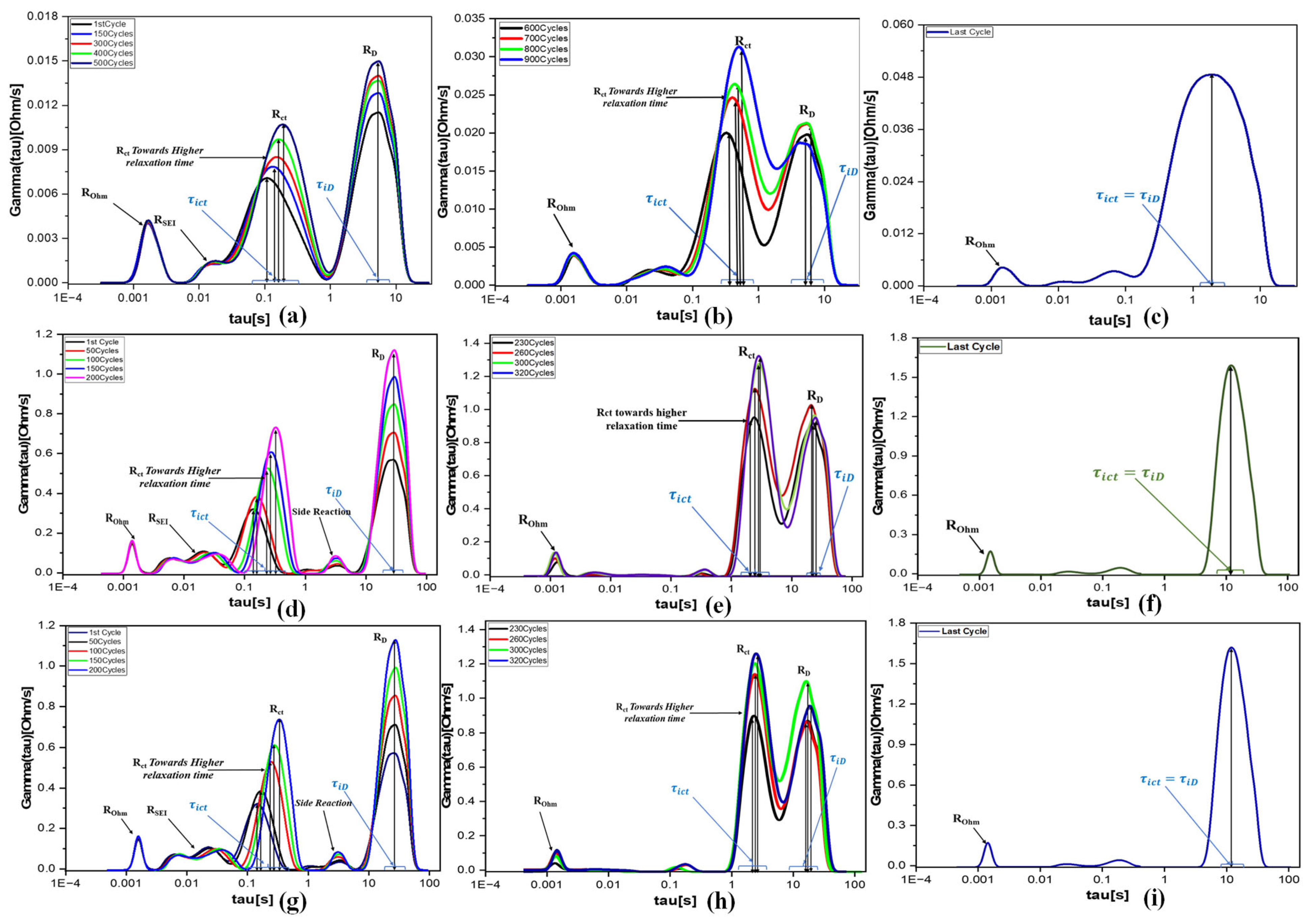 Figure 4, revealed consistent relationships among the variations in the observed peaks. The peak located at the far-right end of each DRT plot, corresponding to the diffusion process, showed a steady increase in height as the number of cycles progressed. This trend was consistent across all DRT plots, suggesting a common behavior pattern as the batteries approached EoL conditions. This observation highlights the continuous evolution and intensification of the diffusion process throughout the battery lifespan.