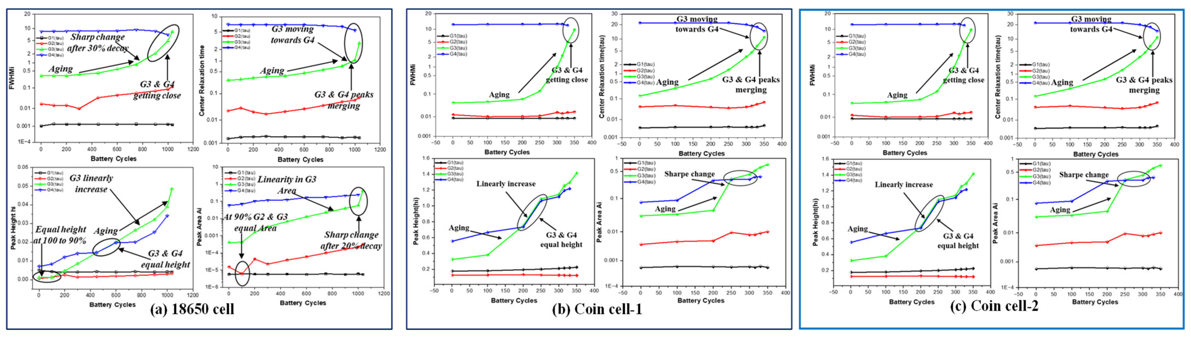 Figure 6, it can be observed that G1(τ) and G2(τ) show minimal variation as the battery approaches its EoL, attributed to the high-quality manufacturing of the anode material and stable SEI layer formation, which increases slightly over time. In contrast, G3(τ) and G4(τ) exhibit significant changes with aging, indicating notable alterations in the LIBs’ electrochemical behavior. Additionally, these peaks gradually converge as the battery nears its EoL.