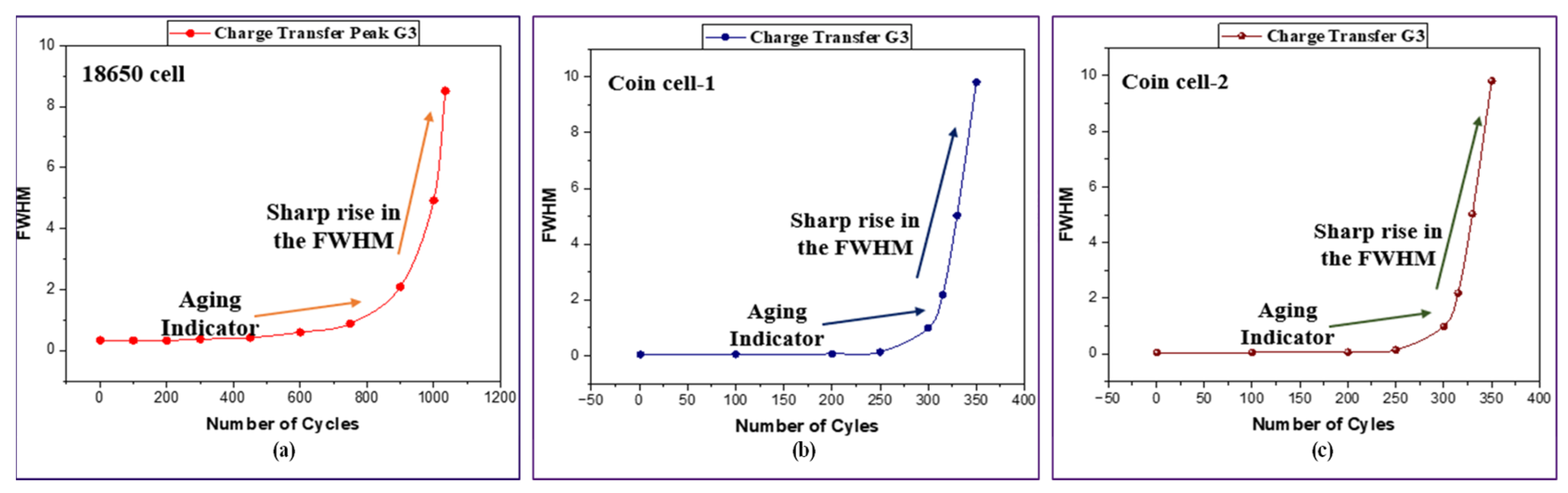 As the battery ages and cycles toward its EoL, the FWHM steadily increases, reflecting the growing complexity of electrochemical processes. This increase in the FWHM indicates reduced uniformity in these processes, driven by material degradation and increased heterogeneity within the battery. At the beginning of the cycles, the FWHM of the G3(τ) peak shows minimal changes, but as the processes approach closer to each other, there is a sharp rise in the FWHM, as shown in