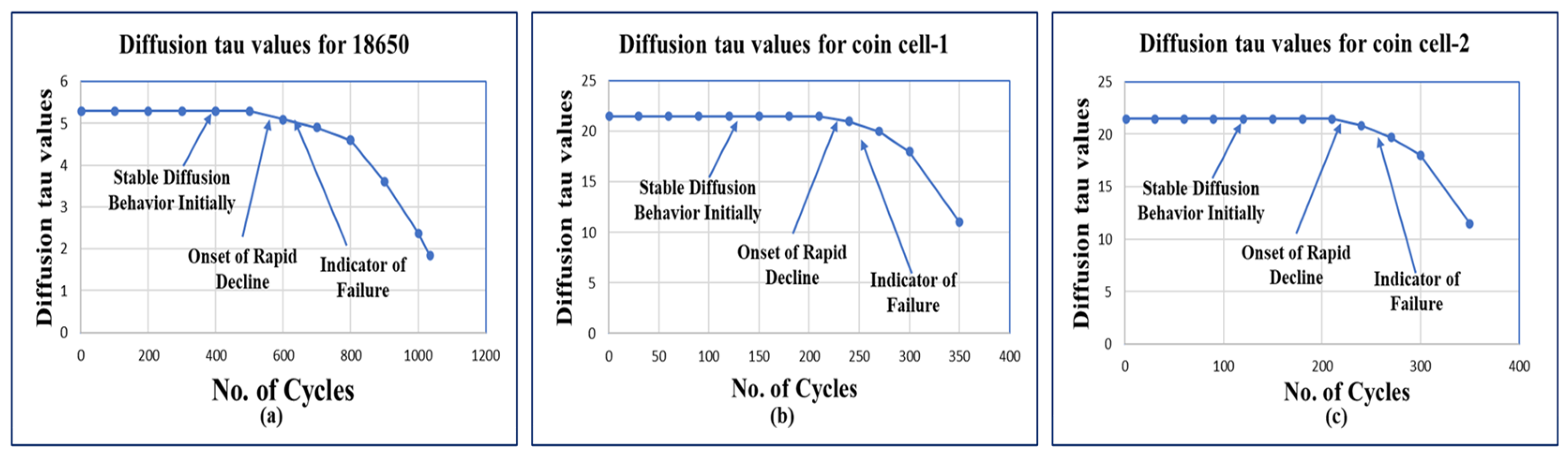 Figure 10, illustrating low variation in the ‘tau’ ratios, which are very close to each other. Among all of the parameters extracted from the DRT analysis, only the tau ratio exhibits a consistent trend across all cells. This trend is expected because as the battery undergoes repeated cycling, the charge transfer process shifts towards higher relaxation times, indicating a slowdown in the process due to the LLI in the battery. This phenomenon is consistently observed in all LIBs, making the tau ratio a critical parameter for evaluating battery status.