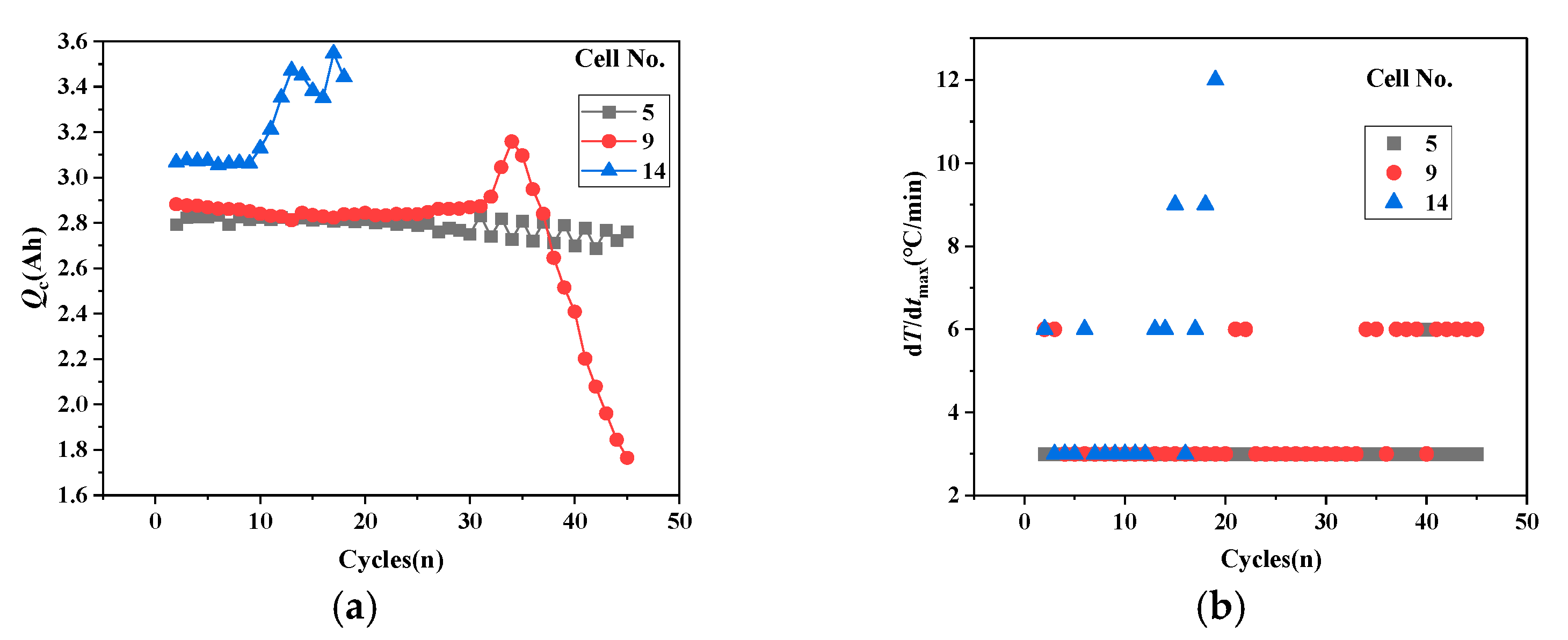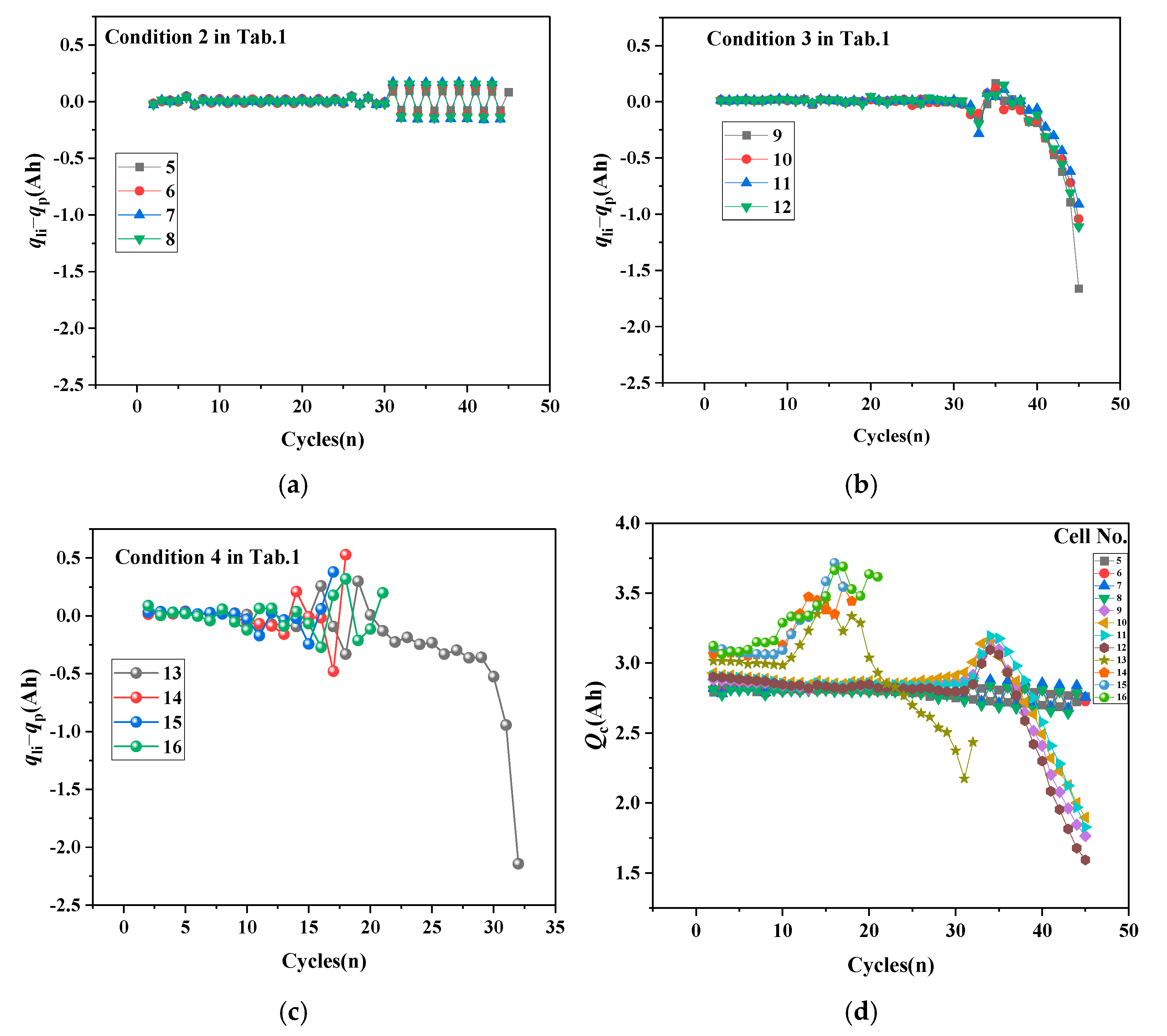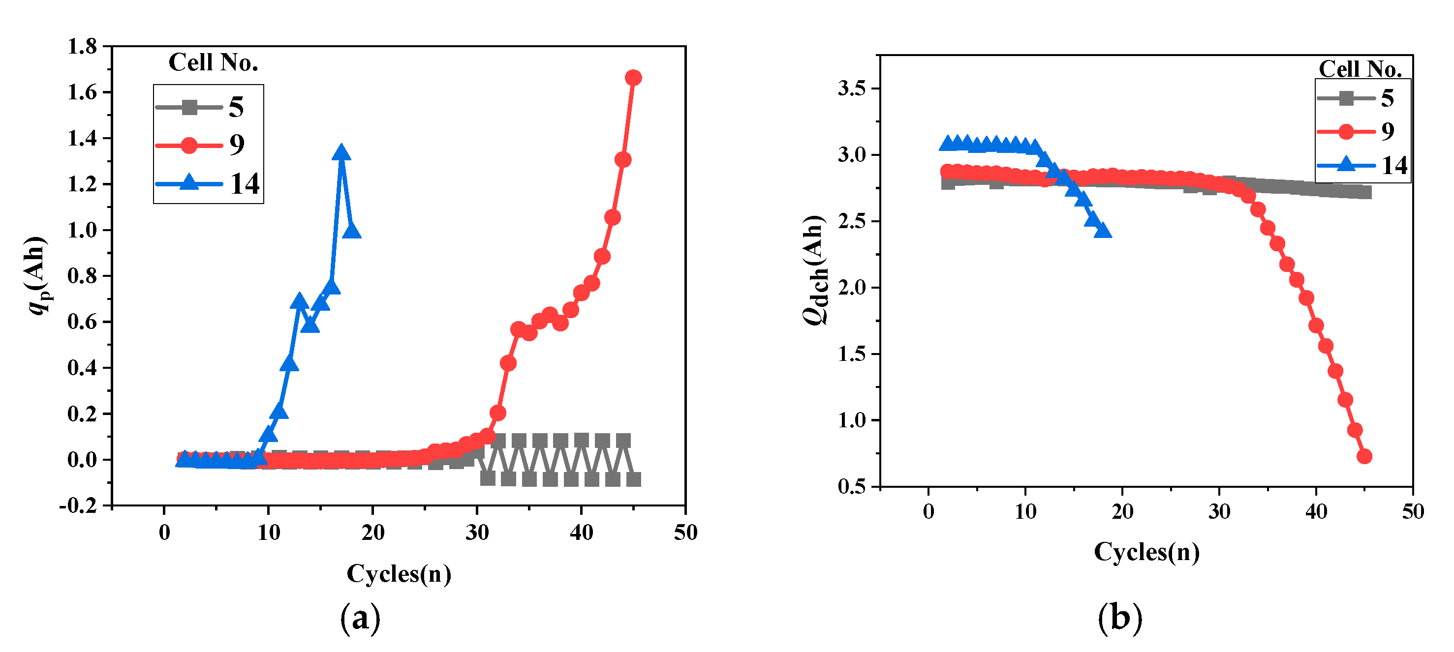 - The battery State of Health (SOH) prediction indicators based on the capacity balance model include the following: (a) The battery development trend: qLi − qp determines the battery development trend. When qLi − qp > 0 continues to increase, thermal runaway occurs; when qLi − qp < 0, battery aging occurs; and when qLi − qp = 0, battery performance remains stable. (b) Development degree assessment: qp indicates battery aging and Qc indicates thermal runaway; the operating conditions can be adjusted to improve these trends.