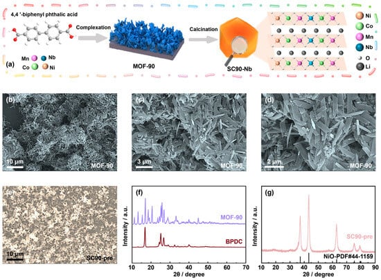 The synthesis framework (Figure 1a) delineates a groundbreaking one-step strategy for fabricating in situ Nb5+-doped SC-NCM. The process commences with solvothermal synthesis of a Ni-Co-Mn MOF, which serves dual roles as both precursor and self-template. Through precise ligand coordination chemistry, pentavalent niobium ions (Nb5+) are pre-anchored within the MOF framework, enabling atomic-level homogeneity during subsequent crystallization. Controlled thermal treatment pathways are then implemented to guide oriented nucleation and anisotropic growth of high-density single-crystal particles. The MOF-90 exhibits a well-defined blade-like morphology with uniform nanoscale dimensions precisely measured at 3 μm in length and 0.5 μm in width, as demonstrated in Figure 1b–d. This distinctive shape arises from a coordinated self-assembly process mediated by precisely regulated synthesis parameters, including controlled deprotonation of organic linkers and optimized thermal treatment pathways. The sharp edges and smooth surfaces of the blades suggest a high crystallinity and low defect density. The unequivocal demonstration of successful BPDC ligand coordination within MOF-90 is conclusively established through X-ray diffraction (XRD) analysis (Figure 1f), a structural verification that highlights the precision of MOF-mediated coordination chemistry [,,]. Figure 1e reveals that the pre-calcined SC90-pre exhibits uniformly distributed nanoscale aggregates with dimensions precisely controlled at approximately 500 nm. XRD analysis, as visualized in the accompanying spectrogram (Figure 1g), confirms the crystalline phase as nickel(II) oxide (NiO) with JCPDS card No. 44-1159. The diffraction pattern displays sharp peaks at 37.2°, 43.3°, and 62.9°, corresponding to the (101), (012), and (110) crystallographic planes.