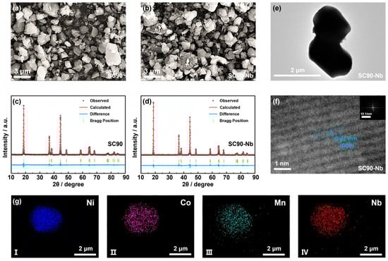 SEM image of (a) SC90 and (b) SC90-Nb, XRD refinement pattern of (c) SC90 and (d) SC90-Nb, (e) TEM image of SC90-Nb, (f) HRTEM image of SC90-Nb and SAED patterns (inset), and (g) Elemental mapping images of SC90-Nb: (I) Ni, (II) Co, (III) Mn, (IV) Nb.