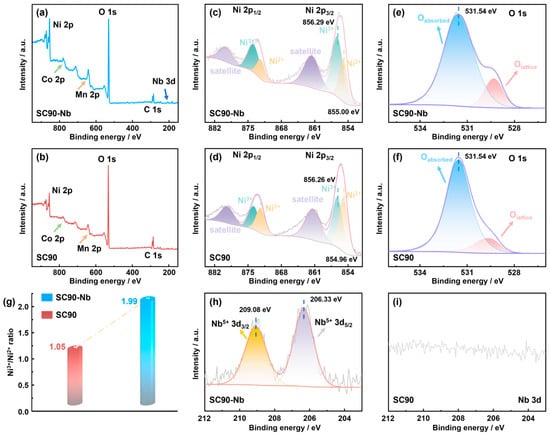 XPS spectra of (a) SC90-Nb and (b) SC90, Ni 2p XPS spectra of (c) SC90-Nb and (d) SC90, O 1s XPS spectra of (e) SC90-Nb and (f) SC90, (g) Ni3+/Ni2+ ratio of SC90 and SC90-Nb, and Nb 3d XPS spectra of (h) SC90-Nb and (i) SC90.