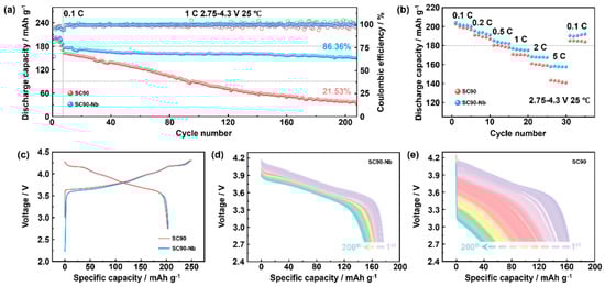 (a) Comparative Cycling Stability Analysis at 1C Rate (2.75−4.30 V) for SC90 and Nb-SC90 Cathodes, (b) Comparative Rate Capability Assessment of SC90 and SC90-Nb electrode systems, (c) Comparative electrochemical signature analysis of initial charge−discharge profiles for SC90 and Nb-SC90 electrodes, and Electrochemical degradation analysis of discharge profiles for (d) SC90-Nb and (e) SC90 electrodes under progressive 1C cycling.