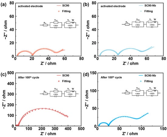 Nyquist impedance analysis of (a) SC90 and (b) SC90-Nb after three cycles of activation, along with Nyquist impedance analysis of (c) SC90 and (d) SC90-Nb after 100th cycle.