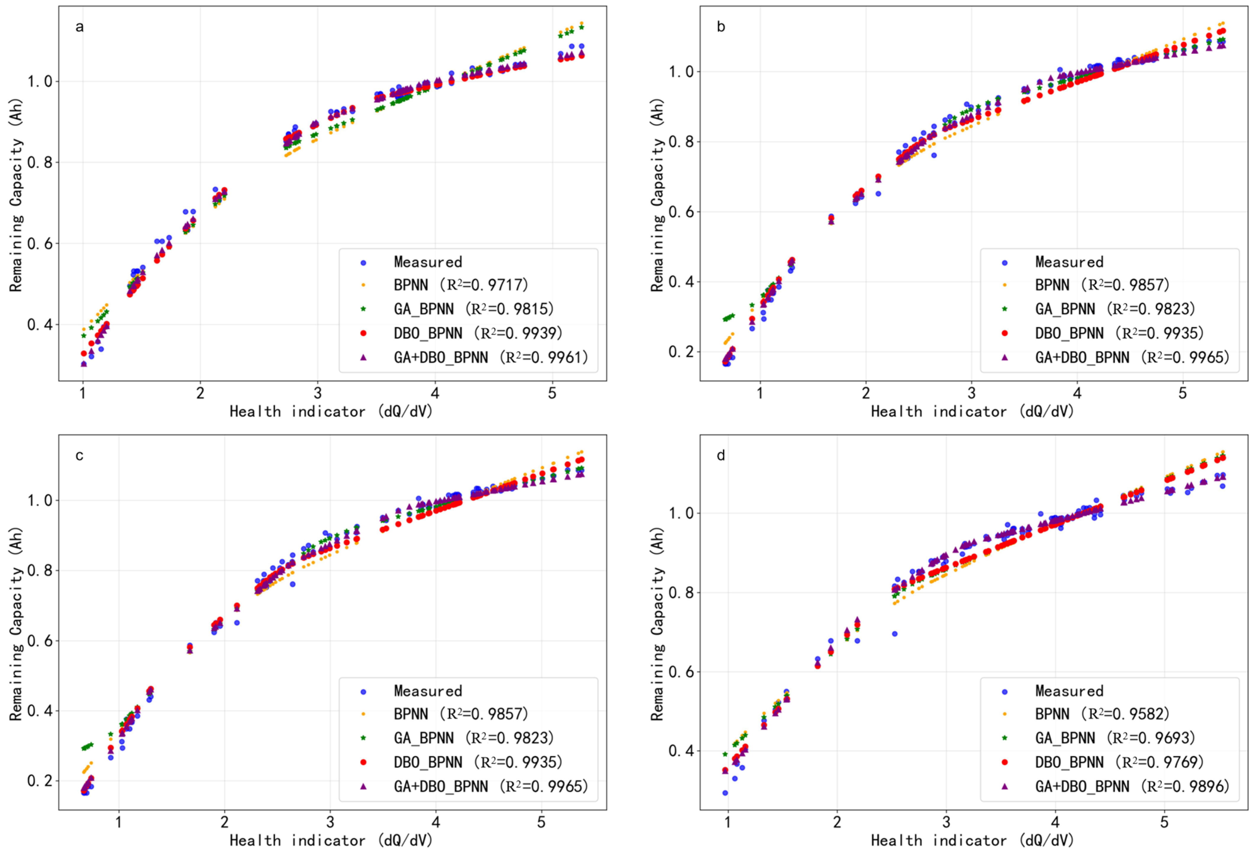 - By jointly applying the GA and DBO to optimize the BPNN model, the initial weights and hyperparameters are effectively adjusted. This helps avoid local optima and accelerates convergence. The co-optimized BPNN achieved an average accuracy improvement of 2.2 percentage points compared to the baseline BPNN, with a maximum R2 of 99.66%, providing a robust and scalable solution for lithium batteries’ capacity prediction.