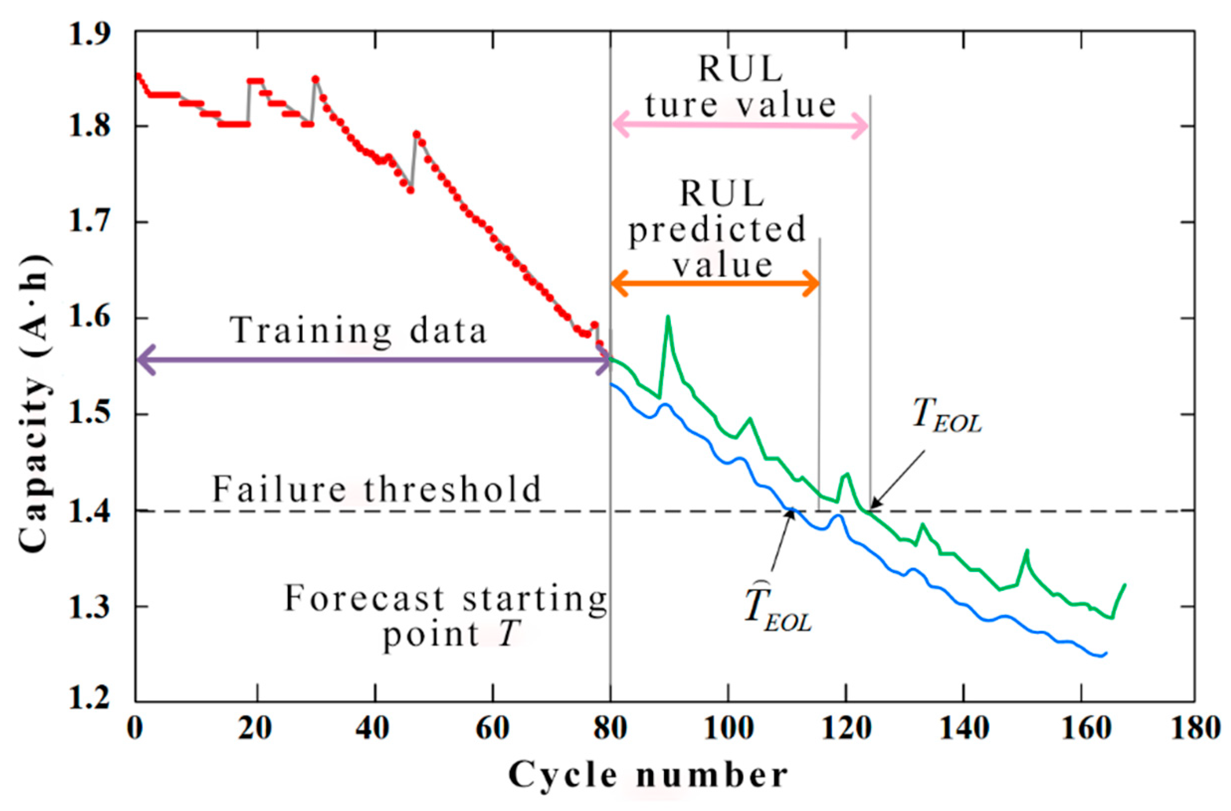 - Zhang, J.; Huang, C.; Chow, M.-Y.; Li, X.; Tian, J.; Luo, H.; Yin, S. A data-model interactive remaining useful life prediction approach of lithium-ion batteries based on PF-BiGRU-TSAM. IEEE Trans. Ind. Informat. 2024, 20, 1144–1154. [Google Scholar] [CrossRef]