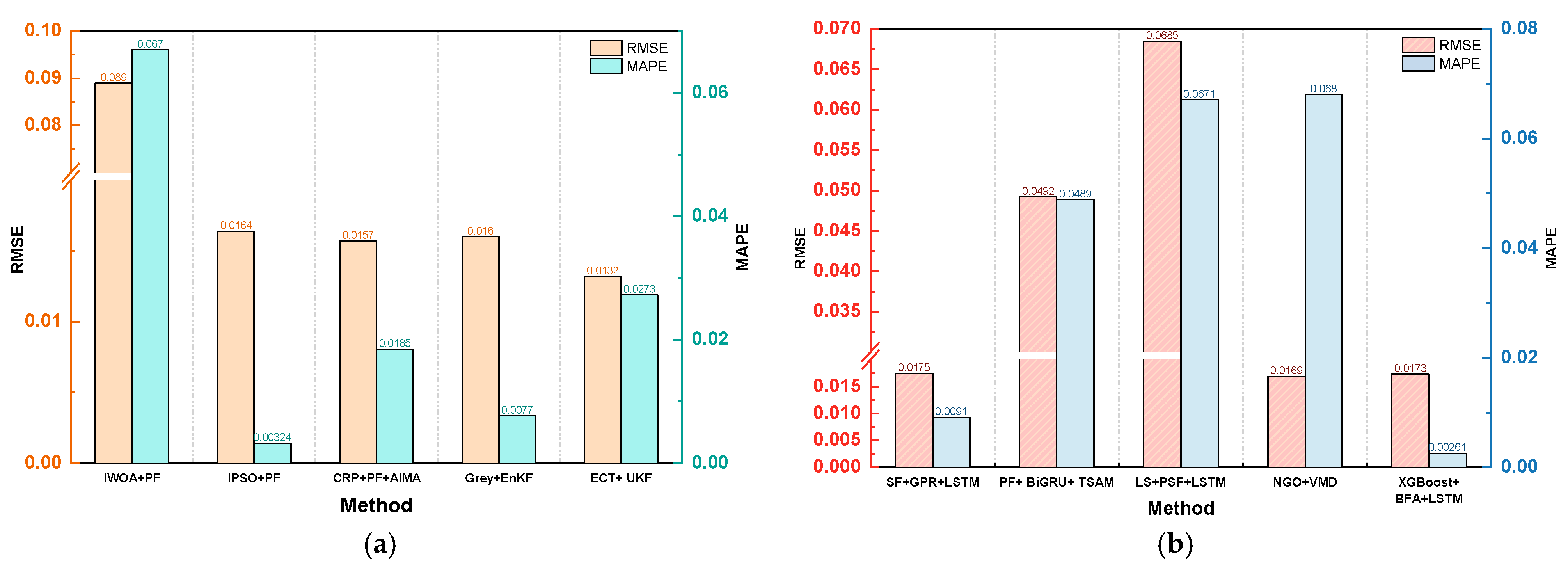 Improved PSO+PF | Strong ability to resist environmental interference | NASA (B5, 6, 7, 18) CALCE (CS2-34, CS2-36, CS2-37) | RMSE = 0.0164 MAPE = 0.00324 | Pang et al. (2024) [175] |