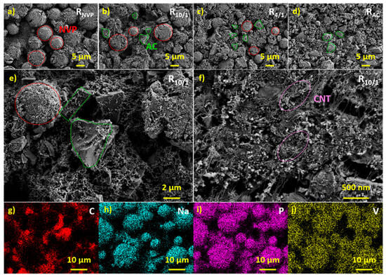 (a–d) Scanning electron microscopy (SEM) images of the RNVP, R10/1, R4/1, and RAC cathode slices at 2k× magnification; (e,f) higher–magnification SEM images of the R10/1 cathode slice at 5k× and 20k×, respectively; (g–j) corresponding elemental mapping of the R10/1 slice, showing the spatial distribution of C, Na, P, and V.