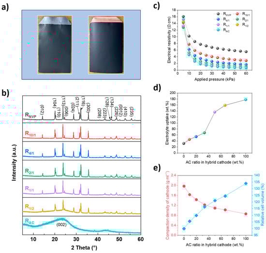 (a) Digital photographs of the R10/1 hybrid cathode and hard carbon (HC) anode slices; (b) X-ray diffraction (XRD) patterns of various cathode slices; (c) electrical resistivity as a function of applied pressure; (d) electrolyte–uptake behavior of different cathode slices; (e) compaction density and relative cell volume versus AC ratio in hybrid cathode.