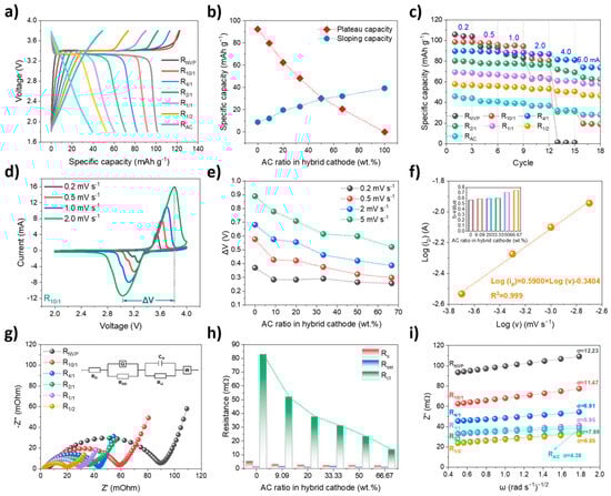 (a) Galvanostatic charge–discharge (GCD) profiles at 0.2 mA; (b) deconvolution of specific capacities into plateau and sloping regions, corresponding to the battery–type and capacitive contribution, respectively; (c) rate capability showing specific capacities at varying current densities; (d) cyclic voltammetry (CV) curves of the R10/1 hybrid cathode at scan rates from 0.2 to 2.0 mV s−1; (e) potential difference (ΔV) between anodic and cathodic peaks; (f) linear dependence of oxidation peak current on the square root of scan rate (ν1/2) for the R10/1 cathode, with corresponding b–values shown in inset; (g) Nyquist plots with equivalent circuit model (inset); (h) fitted resistance components from EIS analysis; (i) relationship between Z’ and ω−1/2 (where ω is angular frequency), demonstrating Warburg diffusion behavior.