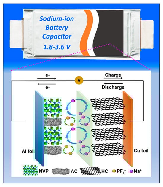 Against the backdrop of increasingly pressing energy shortages and climate change, the widespread deployment of renewable energy sources, such as solar and wind power, is of vital significance to the global community [1]. To address the intrinsic intermittency and unpredictability of renewable power generation, developing advanced electrochemical energy storage (EES) systems has become a critical research priority [2]. Among EES technologies, the integration of battery and capacitor systems has garnered substantial attention. In particular, internal parallel battery capacitors (BatCs) have emerged as a promising solution, capable of simultaneously delivering high energy and power densities, overcoming the limitations of individual components [3,4]. Lithium–ion BatCs (LIBatCs) have demonstrated notable success through various combinations, including (LiCoO2/AC)//Gr [5], (Li2Mn2O4/AC)//HC [5], (LiFePO4/AC)//Gr [6], and (LiNi1/3Co1/3Mn1/3O2/AC)//Gr [7], among others [8]. These systems leverage synergistic effects arising from the complementary energy storage mechanisms of constituent materials. Several LIBatC configurations have already reached commercialization, finding practical applications such as fast–charging city buses, regenerative energy recovery, and grid frequency regulation [9,10]. However, the growing escalating cost of lithium resources since 2020 have underscored the need for sustainable and economically viable alternatives [11].