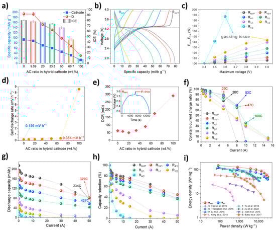 (a) Initial coulombic efficiency (ICE) and reversible specific capacities of the cathode and anode during the first charge/discharge cycle; (b) galvanostatic charge–discharge (GCD) profiles at 100 mA current; (c) energy output at 100 mA current across varying cutoff voltages (3.4–4.0 V); (d) correlation between self–discharge rate and AC ratio; (e) direct current internal resistance (DCR) measured at 100 mA (inset: GCD curve of R10/1); (f) constant–current charge capacity ratio in fast–charge/slow–discharge mode; (g,h) discharge capacity and its retention in slow–charge/fast–discharge mode; (i) Ragone plots comparing R10/1, R4/1, and previously reported works [12,23,33,34,35,36,37,38].
