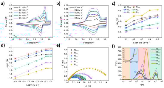 (a,b) CV curves of R2/1 and R1/1 SIBatCs at scan rates ranging from 0.1 to 0.5 mV s−1; (c) potential difference (ΔV) between oxidation and redox peaks as a function of scan rate; (d) linear fitting of Log(ip) versus Log(v); (e) Nyquist plots at a frequency ranging from 100 kHz to 0.05 Hz; (f) distribution of relaxation times (DRT) analysis derived from EIS data.