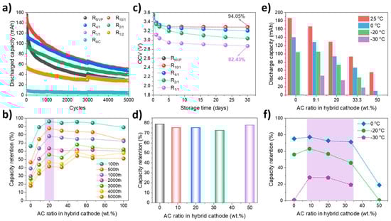 Low–temperature discharge capability was evaluated under a discharge current of 1 A. As shown in Figure 7e,f, R10/1 exhibits capacity retentions of 77.2%, 63.1%, and 28.3% at 0 °C, −20 °C, and −30 °C, respectively. In comparison, RNVP demonstrates retentions of 75.3% and 56.0% at 0 °C and −20 °C but fails to operate at −30 °C due to excessive internal resistance (IR) drop and sluggish ion diffusion. R4/1 and R2/1 also maintain notable capacity retentions of 28.0% and 19.5% at –30 °C, underscoring the beneficial role of moderate AC addition in enhancing kinetics under extreme conditions. To ensure balanced performance at low–temperature environments, the AC ratio should be limited to a maximum of 33.3 wt.%, which effectively mitigates the trade–off between energy retention and polarization resistance, enabling stable operation over a wide temperature range.
