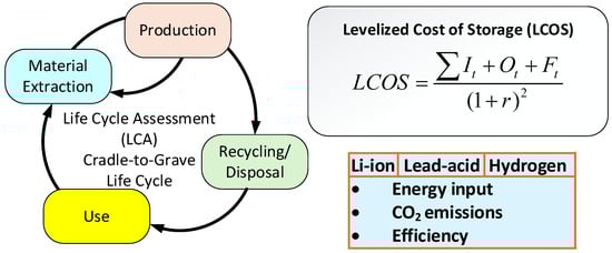 Alongside LCA, economic analysis using the Levelized Cost of Storage (LCOS) offers a quantitative measure of the total cost of energy provided by the system over its operational lifetime. LCOS accounts for capital investment, operation, and maintenance costs, conversion efficiency, and usage frequency. Comparing LCA and LCOS helps identify technologies that simultaneously reduce environmental impact and deliver competitively priced stored energy.