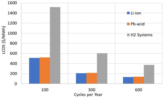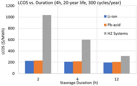 Pb-acid batteries, while often cheaper to procure initially, show a higher LCOS over their lifetime due to shorter cycle life and lower efficiency (70 ÷ 85%), leading to higher per-unit costs of delivered energy [5,18,19,20]. The economics of hydrogen systems are markedly different: their high CAPEX (for electrolyzers, storage tanks, and fuel cells/turbines) and low round-trip efficiency result in LCOS values several times higher than those of Li-ion in short-duration storage scenarios. However, the relative cost penalty decreases significantly for storage durations exceeding 12 h, where the marginal cost per unit of stored energy for hydrogen systems approaches that of battery technologies [24,25,26].
