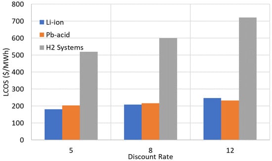 Increasing the discount rate increases the LCOS for all cases (Figure 4), as expected for capital-intensive assets. The effect is most pronounced for hydrogen due to its higher target investment and longer effective payback period, while batteries are relatively less sensitive.